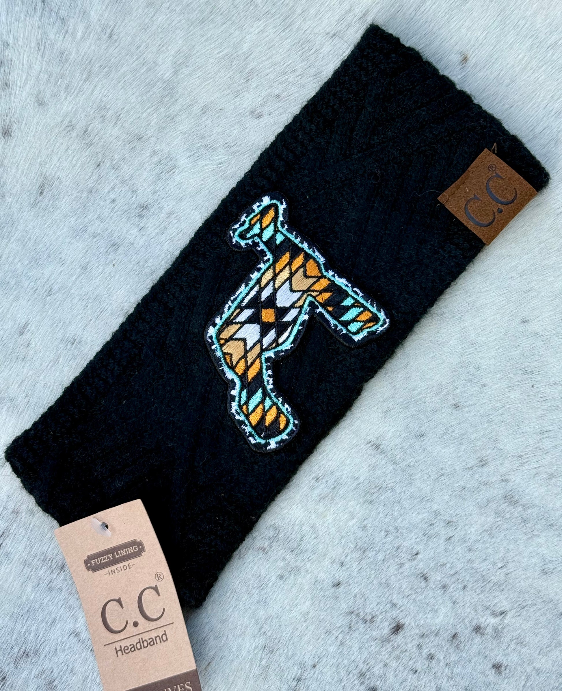 This black C.C® knit headband features an iron-on embroidered show lamb patch with a colorful patterned design. Stretchy knit for a comfortable fit.