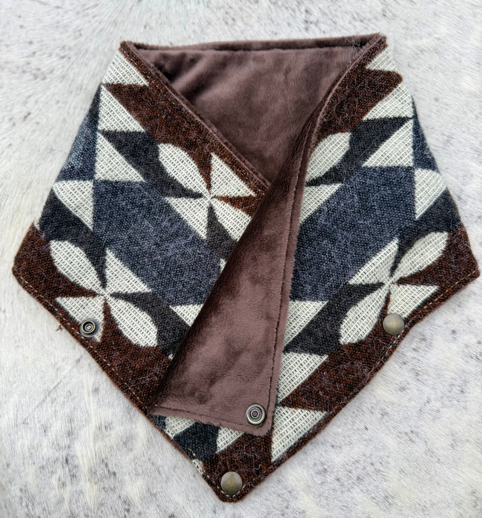Stay cozy with this cowboy cowl that is made from aztec print ALPACA wool and lined with the softest fuzzy fabric for that perfect mix of comfort and style.