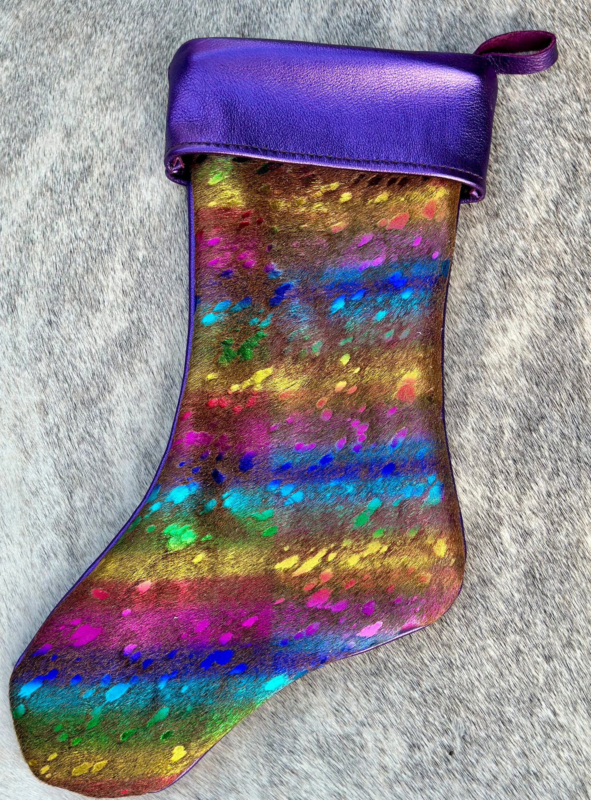 Crafted from acid-wash hair-on-hide cowhide, this stocking features a striking hair-on-hide front, smooth metallic leather backing, and a stylish fold-over top. Each one measures approximately 17” long, making it a bold and unique addition to your décor.