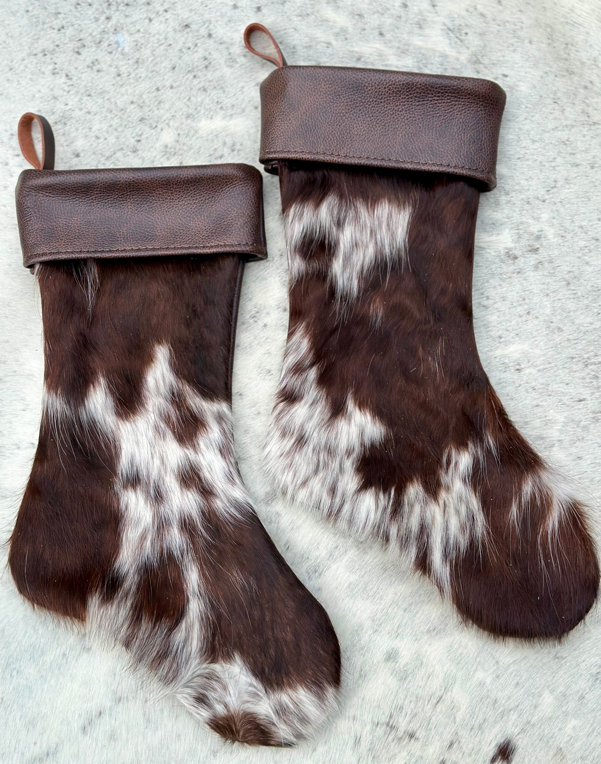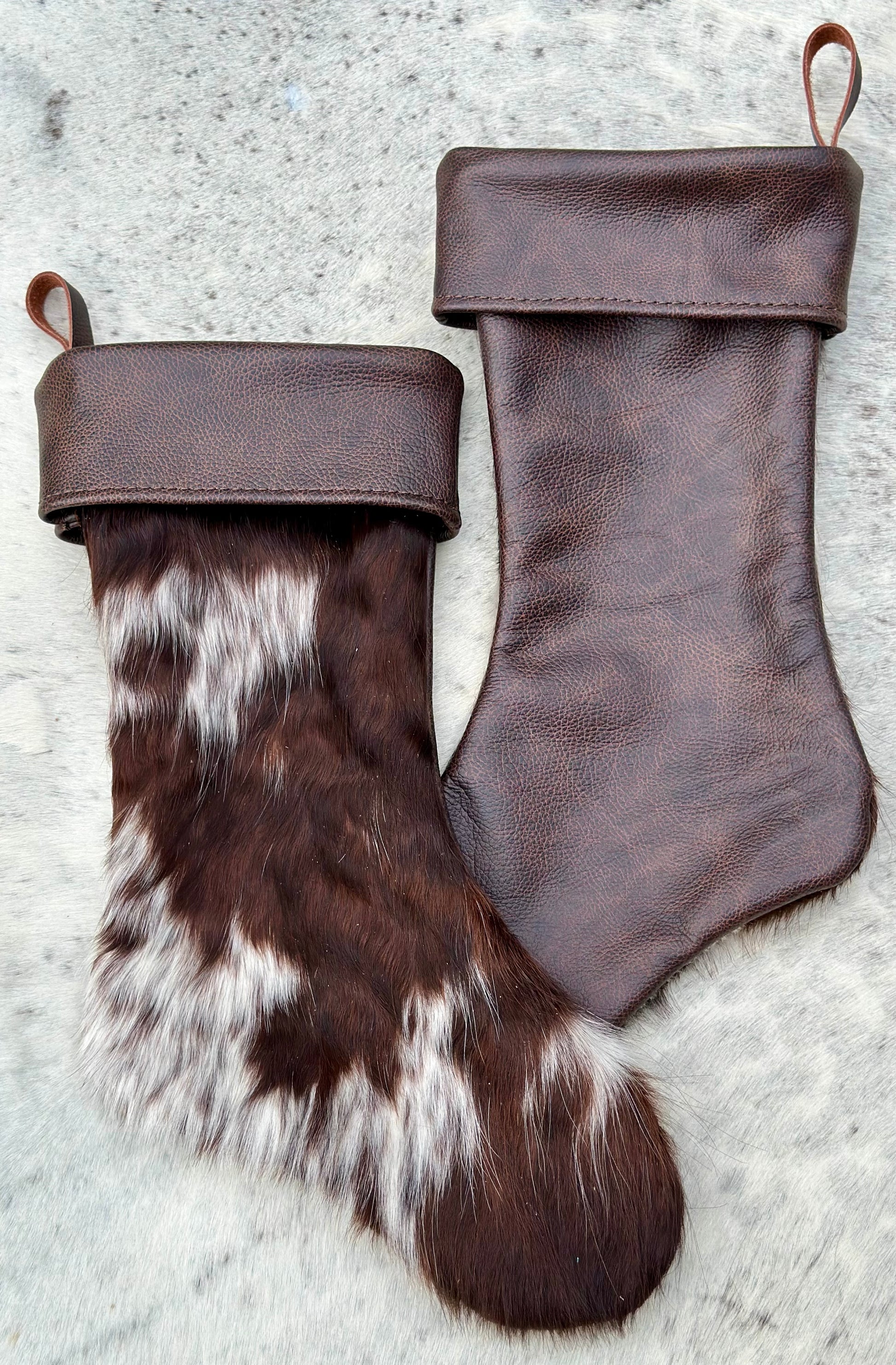 Featuring a hair-on-hide cowhide front and a smooth leather back, this stocking is finished with a stylish fold-over top. Measuring approximately 17” tall, it’s a unique handcrafted piece designed to stand out.