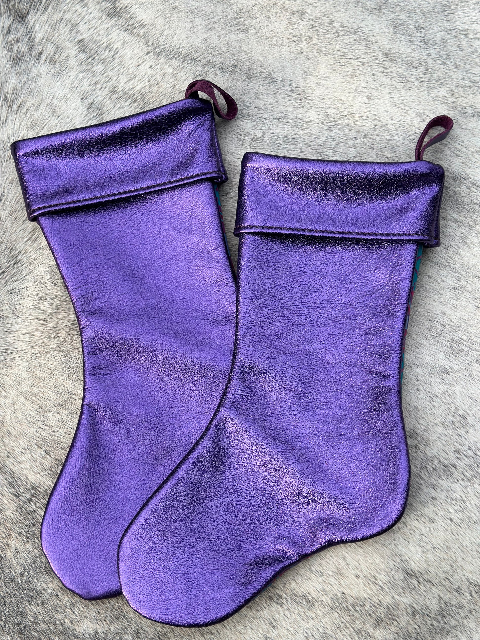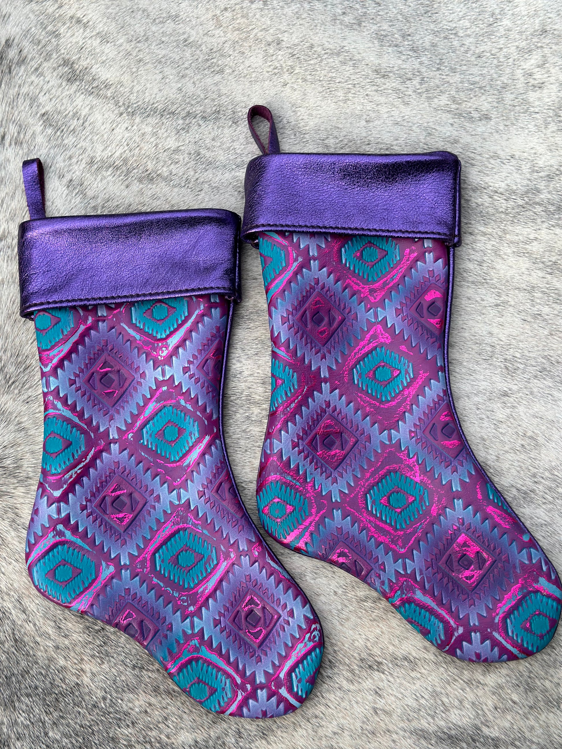 Rio Aztec embossed leather stockings with smooth metallic leather back and fold over top.