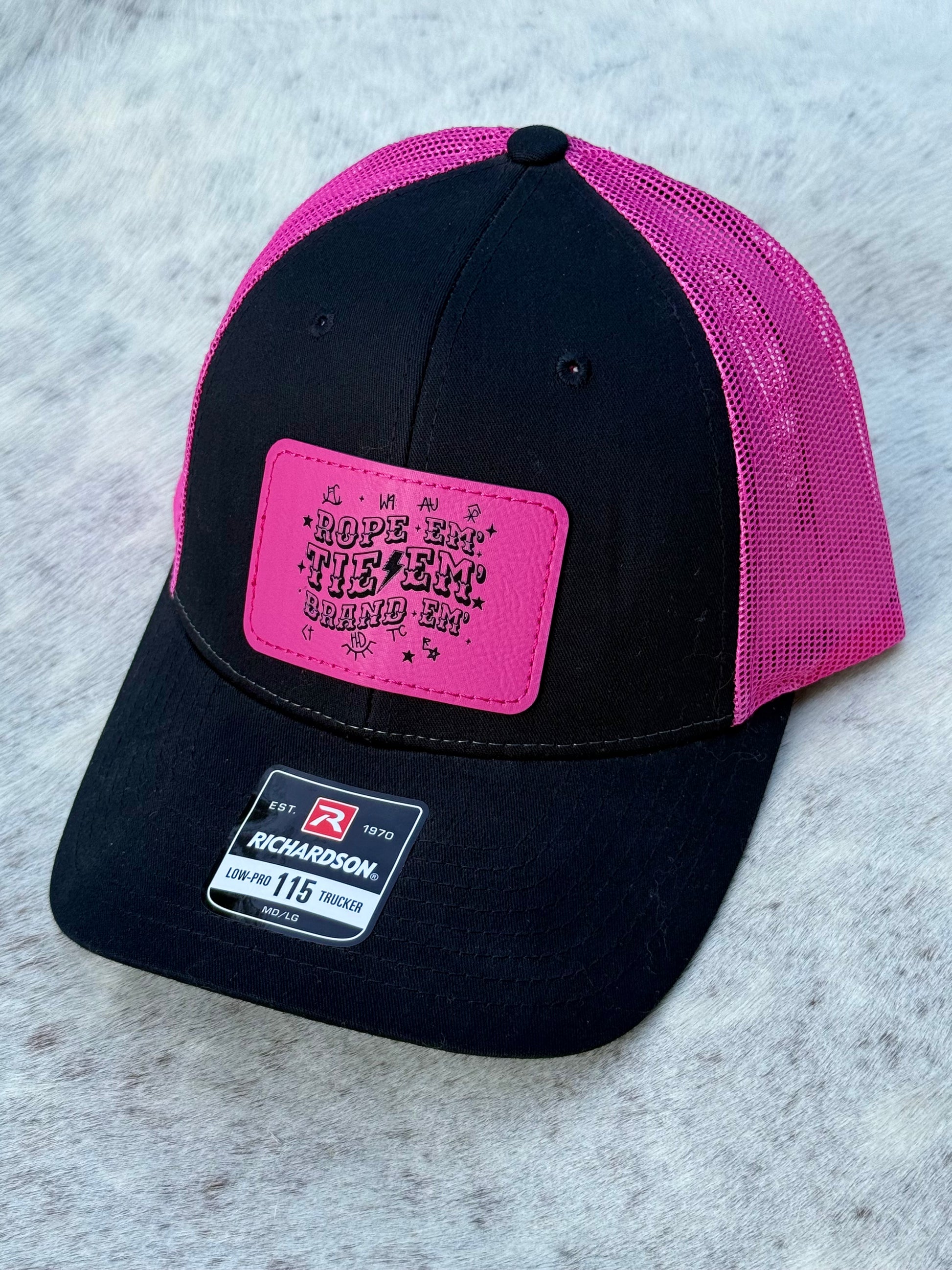 Richardson 115 Trucker Hat – Black & Pink with Engraved Leatherette Patch