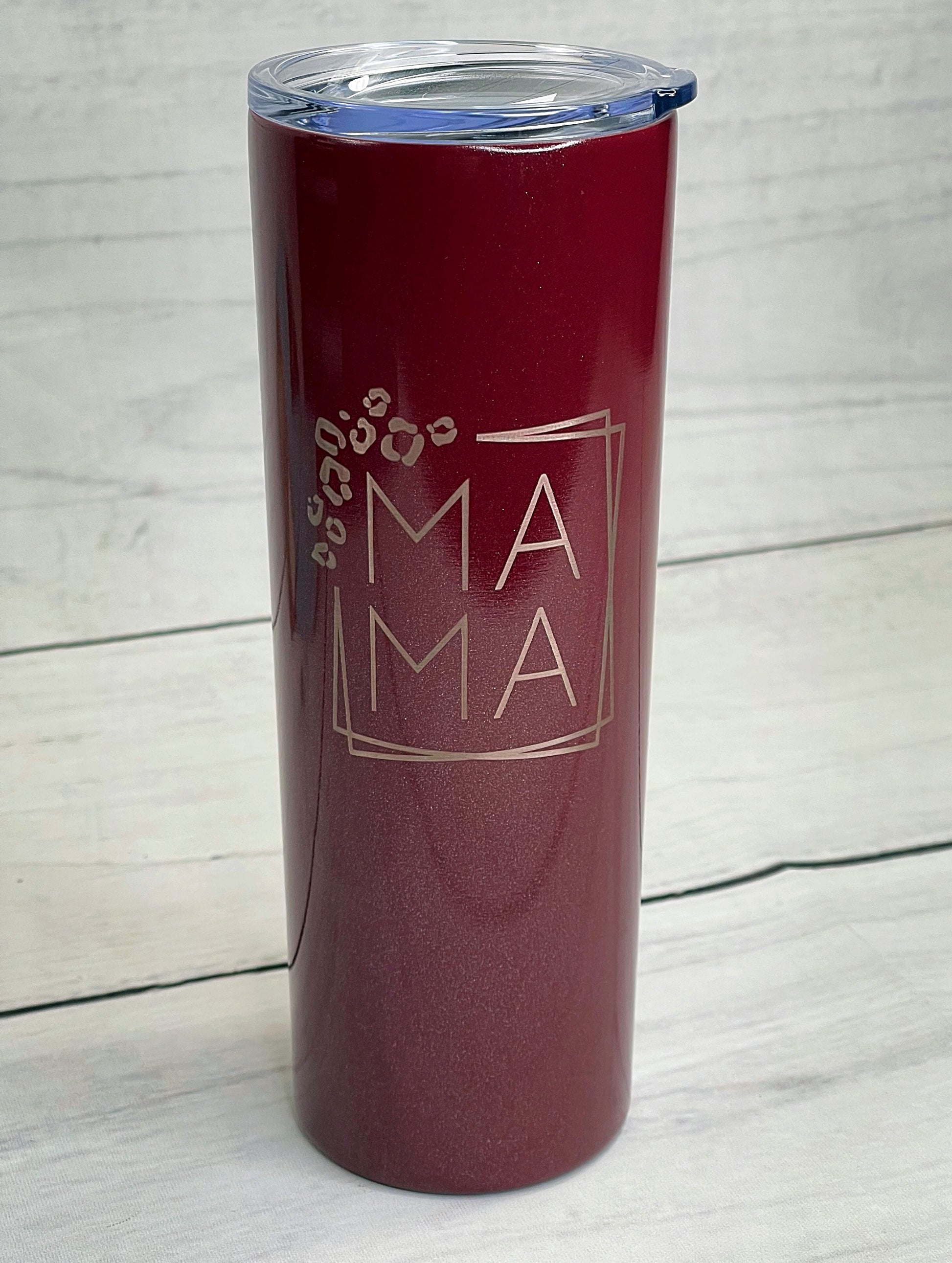 Engraved 20oz skinny double wall 18/8 stainless steel thermal bottle with a powder coated finish that protects against chips and scratches.